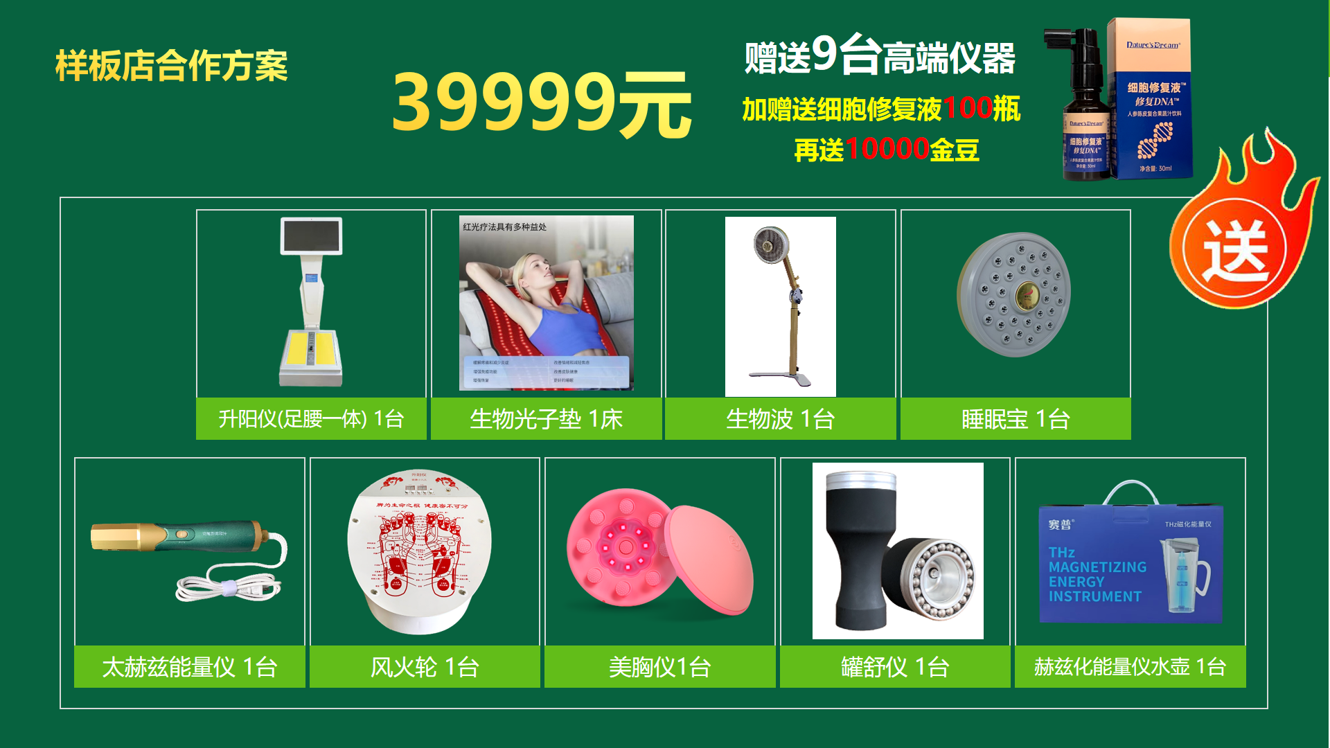 赠送9台高端仪器,100瓶细胞修复液,10000金豆