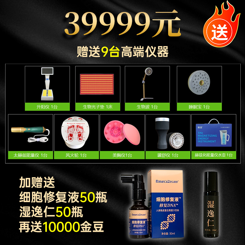 赠送9台高端仪器,50瓶细胞修复液,50瓶湿逸仁,10000金豆
